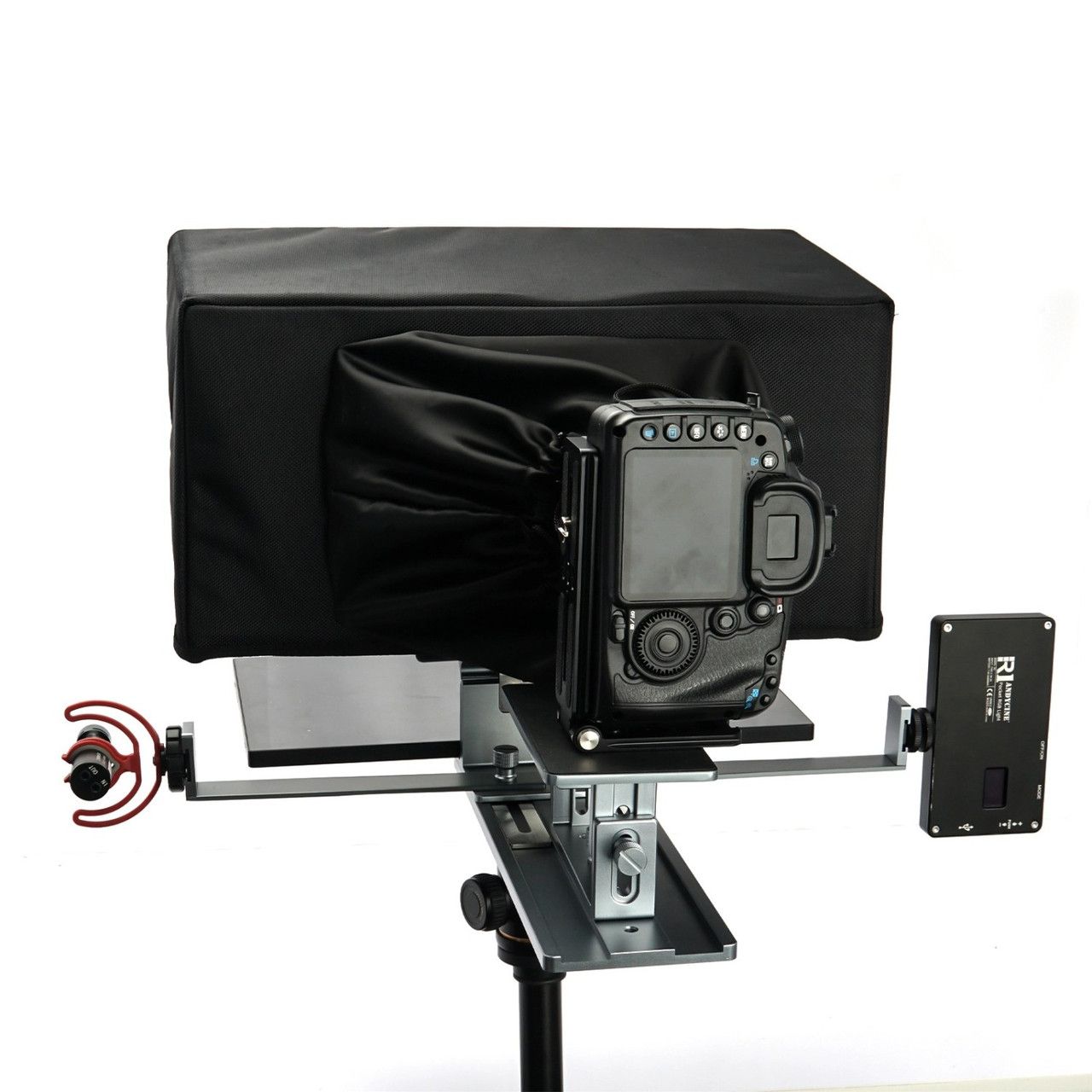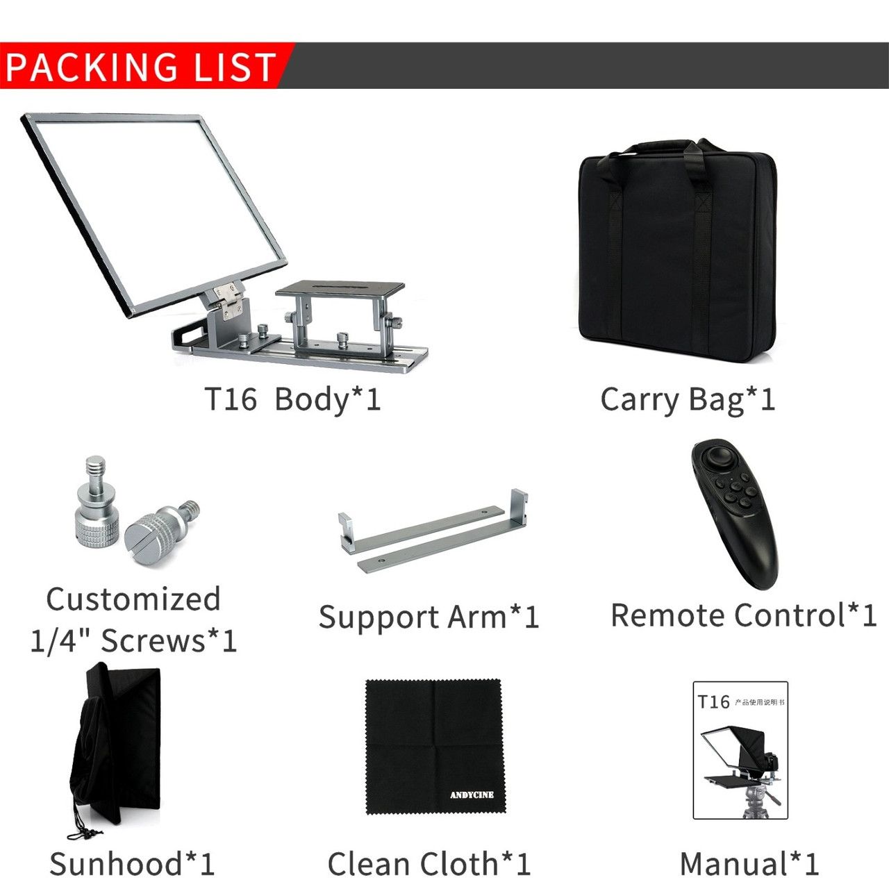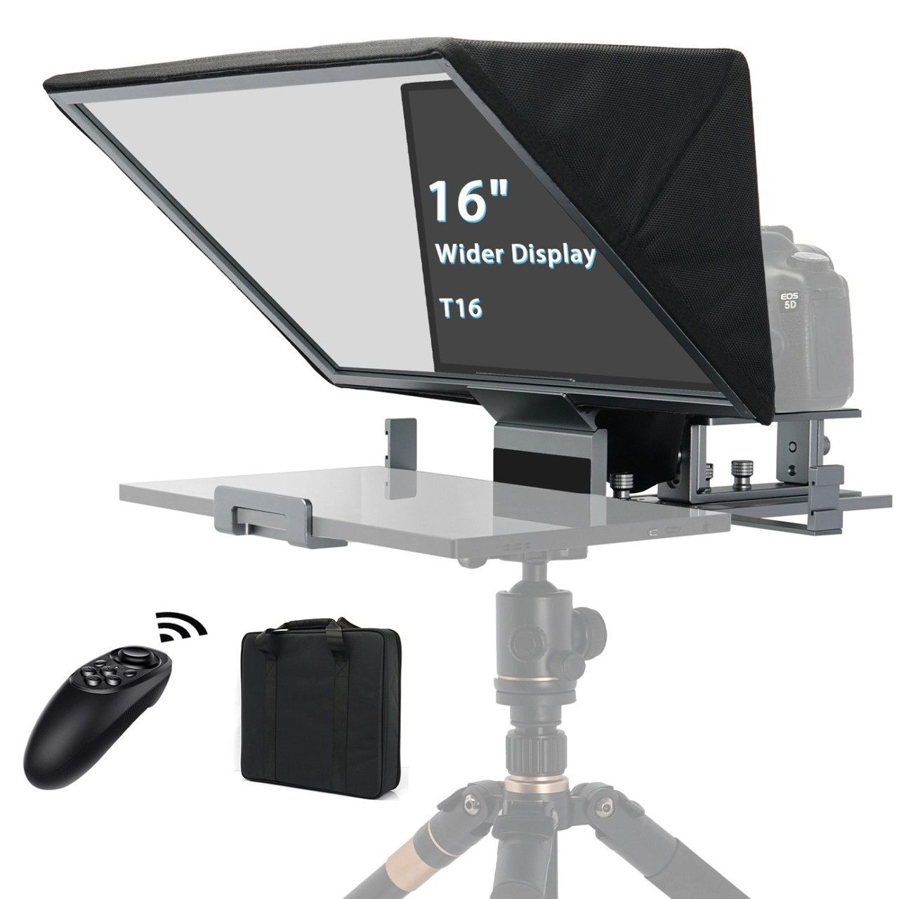 Телесуфлер TP16 знімним кожухом з алюмінієвого сплаву, сумісний із дзеркальними й бездзеркальними камерами та смартфонами в комплекті з пультом пульта дистанційного керування Чітке та зручне візуальне сприйняття 16-дюймовий розмір телесуфлера робить мовлення плавнішим і природнішим. Оптичне скло з поділом променя 70/30 забезпечує світлопропускання до 97%, забезпечує чітке відбиття. Скло з поліпшеним відбиттям — телесуфлер TP16 обладнаний оптичним склом класу 70/30, яке сприяє чудовому передаванню зображення й гарному ефекту відбиття. Легко читається й дає змогу уникнути фантомних зображень і тіней, що перекриваються, а також забезпечує більш високе передавання й чіткі зображення. Зробіть ваше мовлення й пряму трансляцію плавнішою. Алюмінієвий корпус виготовлений на високоточному ЧПУ з двома важелями та холодним черевиком для кріплення світлодіодного освітлення й мікрофонів. Знімний козирок і складана основа легко упаковуються в сумку. Із затискачем телесуфлер підтримує планшет, монітор, дисплеї до 16 дюймів. У комплекті є пульт дистанційного керування Bluetooth, який можна використовувати із застосунком «ANDYCINE» (безладно завантажте з Apple Store або Google Play) або будь-який зручний для вас. Легко керувати швидкістю мовлення й настроювати розмір шрифту, прокручувати вгору та вниз тощо в процесі мовлення й потокового мовлення.