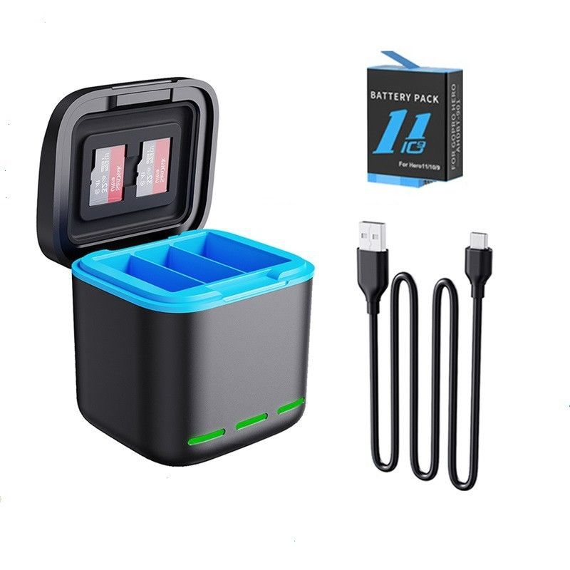 Зарядний пристрій — бокс для зберігання — 3 акумуляторів для GoPro Hero 9, 10, 11, 12 (AHDBT-901, AJBAT-001, ADBAT-001, SPBL1B) и карт памяти с кабелем TYPE-C -USB (Telesin GP-BNC-901) + 1 акумулятора