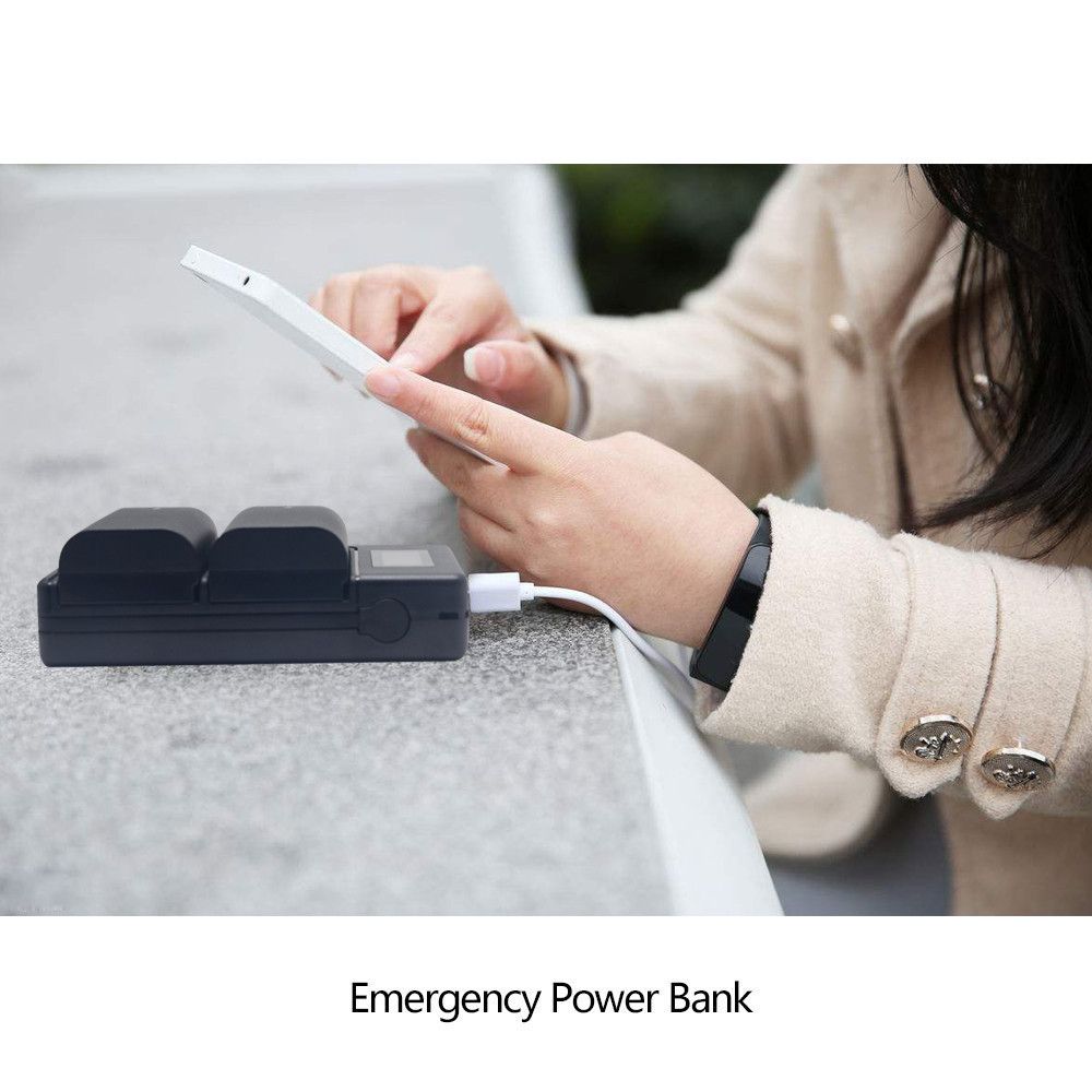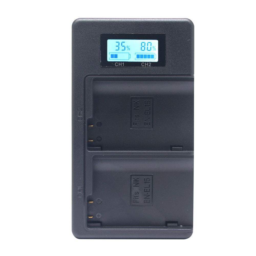 USB зарядний пристрій для двох акумуляторів з великою швидкістю заряду (до 1000mA) акумуляторів Nikon EN-EL15. Зарядне оснащене LCD дисплеїв для кожного каналу, що показує рівень заряду на кожну батарею.