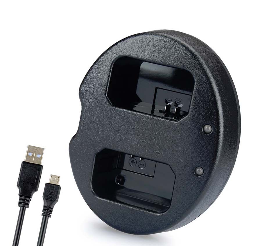 USB зарядний пристрій для двох акумуляторів з високою швидкістю заряду (до 800mA) акумуляторів Sony NP-FW50. Зарядне оснащене індикатором рівня заряду на кожну батарею.