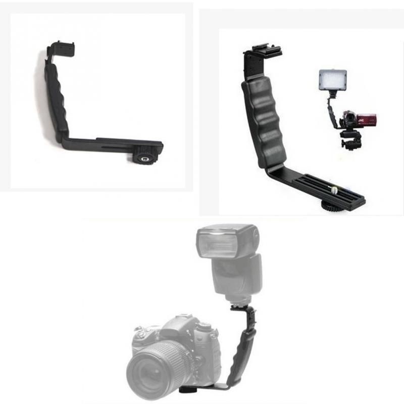 Відео ручка-держувач L- образна Для того щоб відеокамера була зручною, можна стабілізувати положення камери під час знімання. Насичення 2-х роз'ємів типу « гарячий башмак» на відео ручка дозволяє встановити відео-світ, спалах або виносний мікрофон або через спеціальні можна використовувати смартфон як дисплей. Існує можливість встановлення відео- ручки на штатив або монопод. Використовуючи відео ручки, ми можемо вести зйомку з складними ракурсами. За допомогою відео- ручки можна проводити зйомку коли займаємося екстремальними видами спорту і відпочинку.