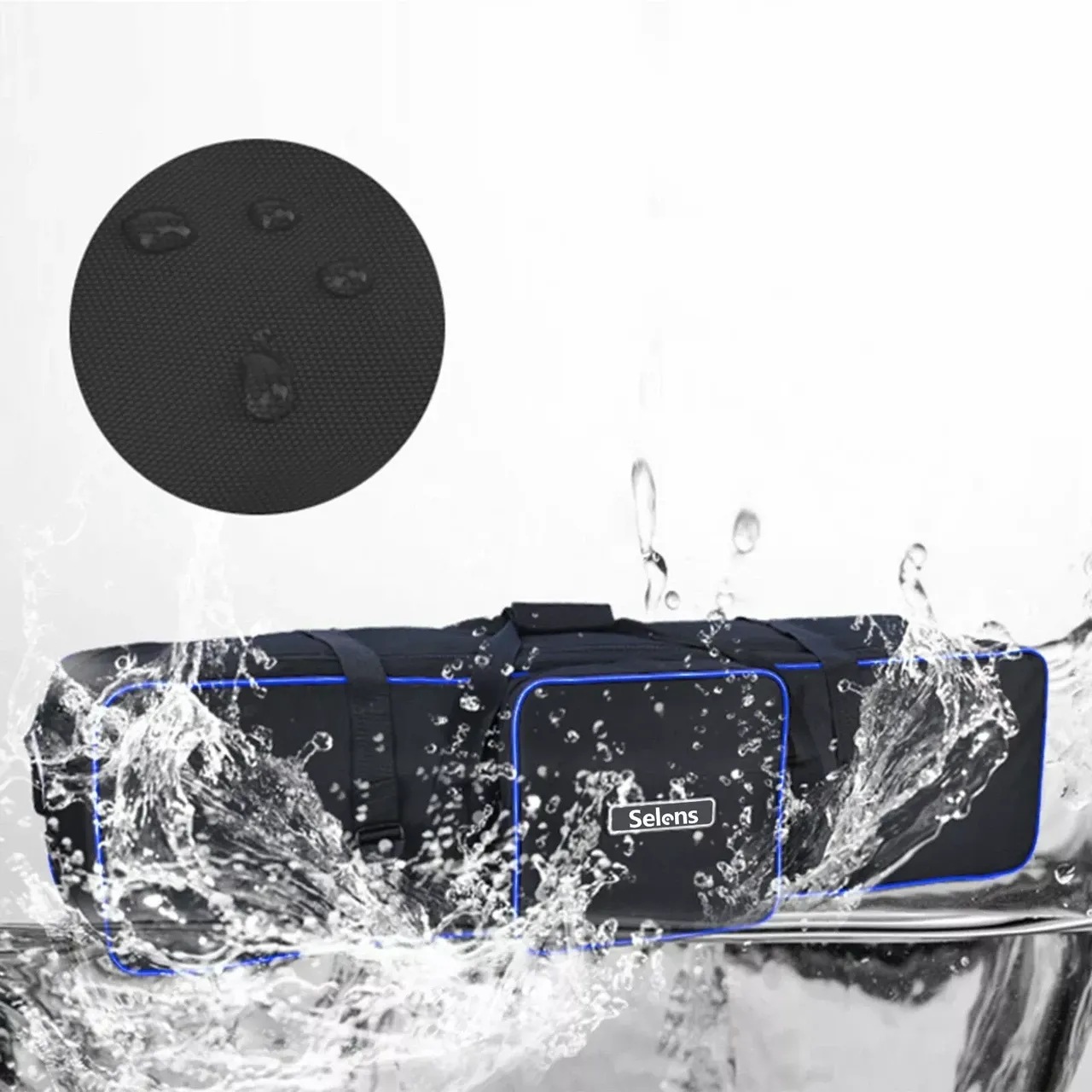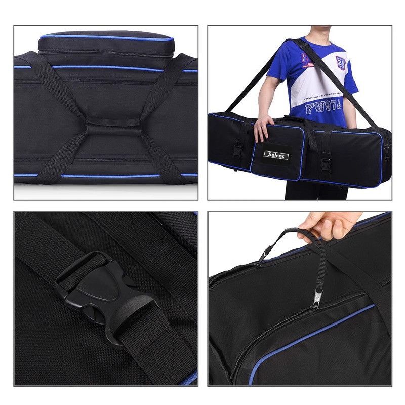 Ця сумка від Selens для перенесення фото-відеобладнання. Ця сумка для перенесення освітлювального обладнання добре спроєктована для перенесення студійного обладнання. Міцна нейлонова сумка надійно захищає ваше освітлювальне обладнання під час перенесення. Її оптимальний розмір підходить для більшості освітлювальних комплектів, а три окремих нейлонових відсіки всередині допоможуть розділити ваші штативи та стійки, запобігти їх пошкодженню один об одного, забезпечуючи безпечніший спосіб захисту вашого обладнання.